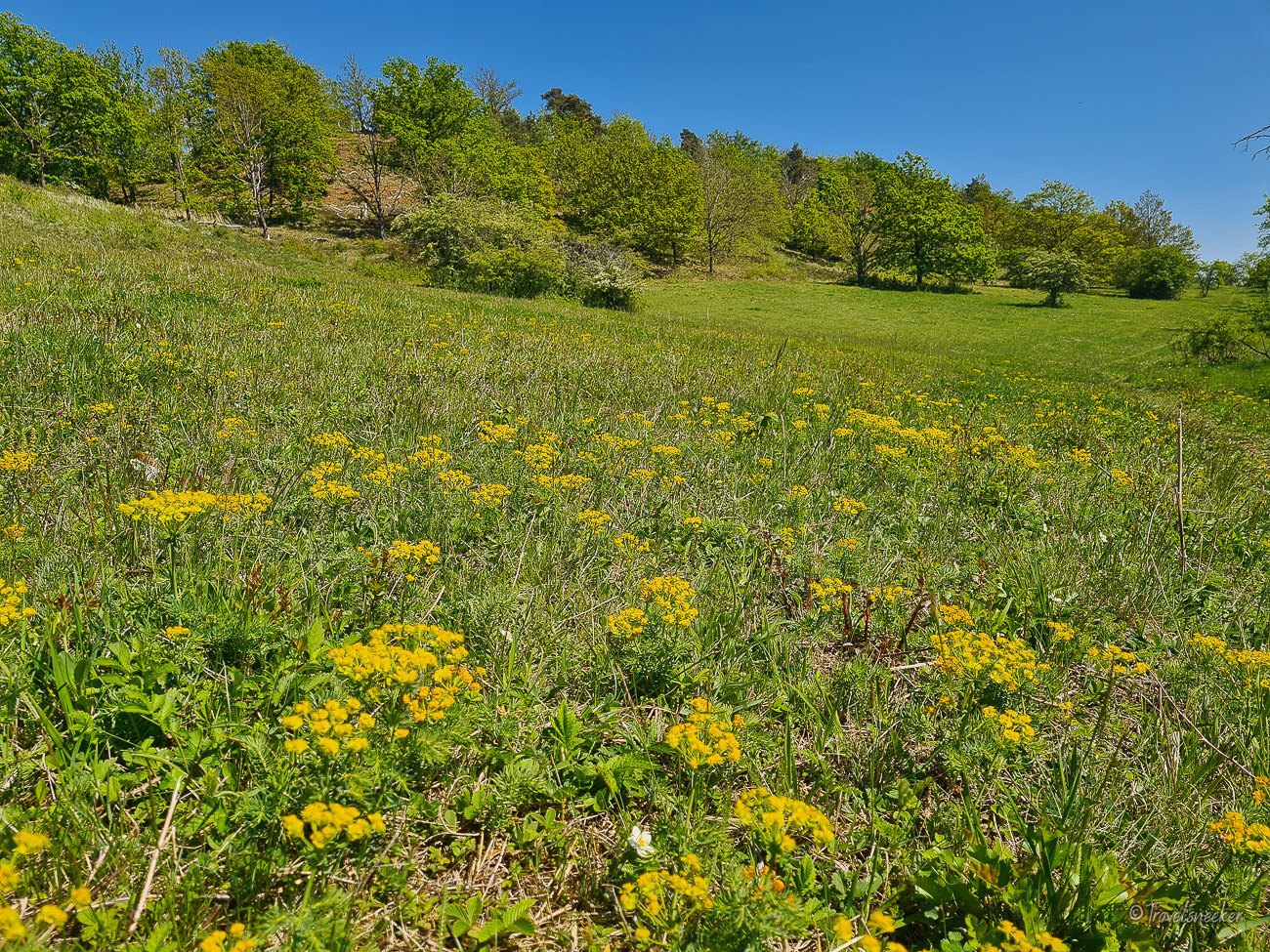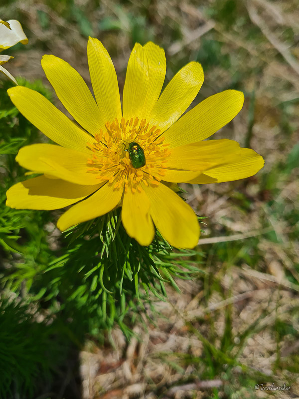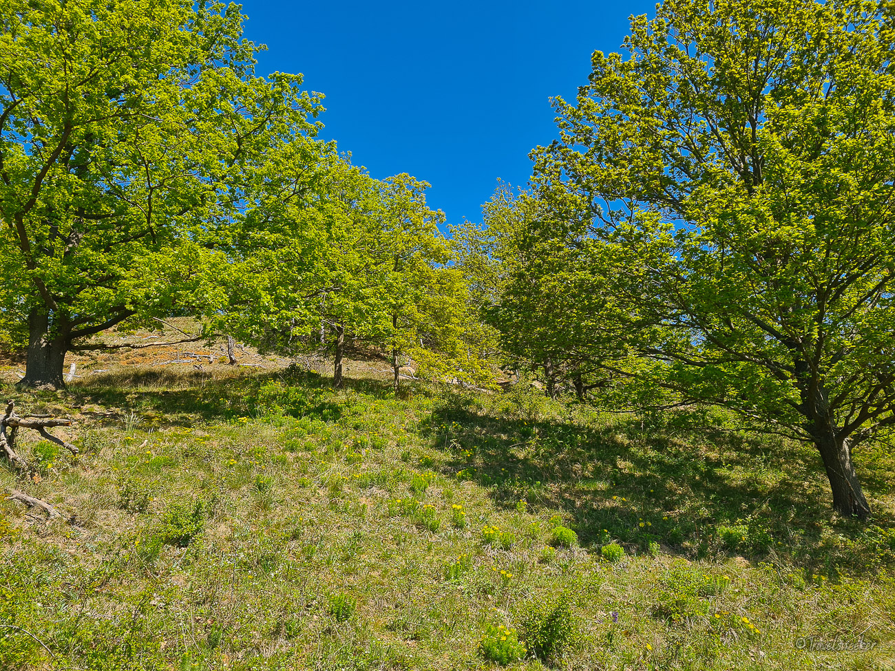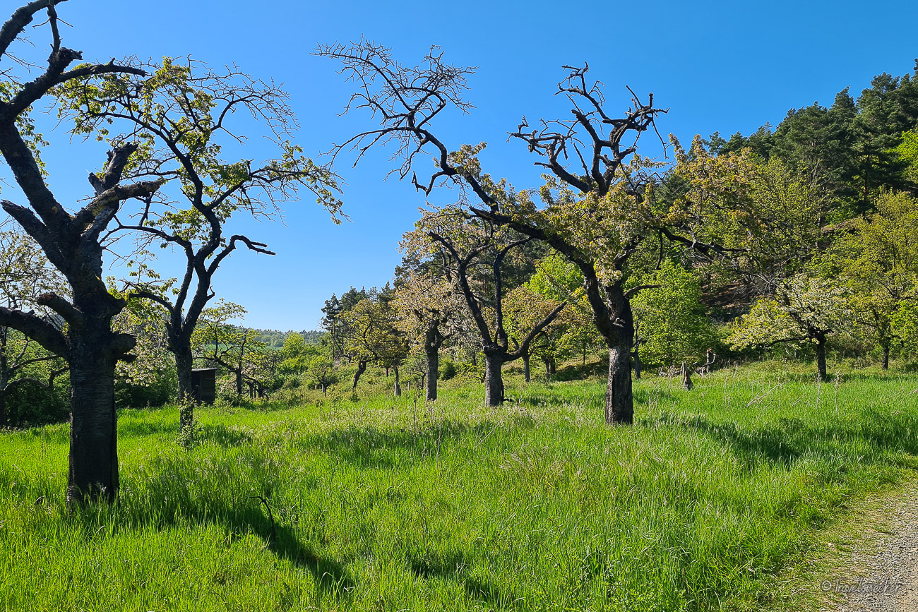 Diese schöne Rundwanderung macht man am besten im Frühjahr, wenn die Streuobstwiesen bühen. Wir waren ein kleines bisschen zu spät dran, denn die Obstbäume wurden schon grün und hatten überwiegend ihre Fruchtbüten verloren. Dennoch hat es sich gelohnt, denn die Streuobstwiesen sind nicht das einzige Highlight. Wenn man von Börnecke aus startend den Betonweg bis zu den Streuobstwiesen hoch geht und am Schusterberg rechts einen schmalen Weg hoch geht, kommt man nach kurzer Zeit zu einem Hang mit Adonisröschen. Ich wusste gar nicht, dass es hier auch welche gibt, denn wir hatten extra mal eine Wanderung zu den Adonisröschen bei Hoppenstedt Nähe Hornburg gemacht. Es war für uns eine positive Überraschung, zumal an diesem Hang (für mein Empfinden) mehr Adonisröschen zu sehen waren. Der leicht versteckte und nicht sofort erkennbare Weg ist allerdings tatsächlich schlecht zu finden, da das Schild zu der Adonisröschen-Wiese genau an dem Punkt irreführend geradeaus zeigt.
