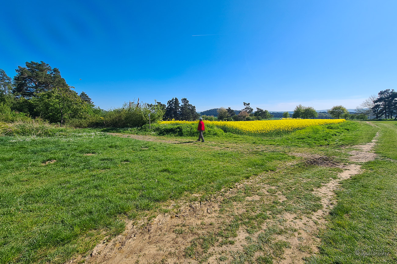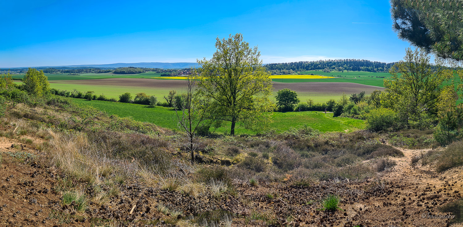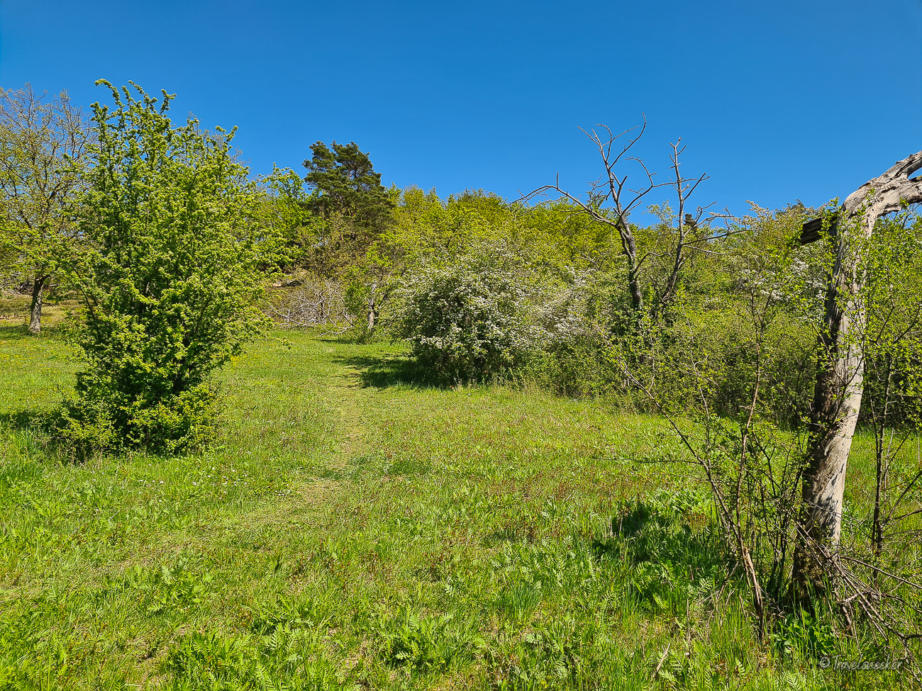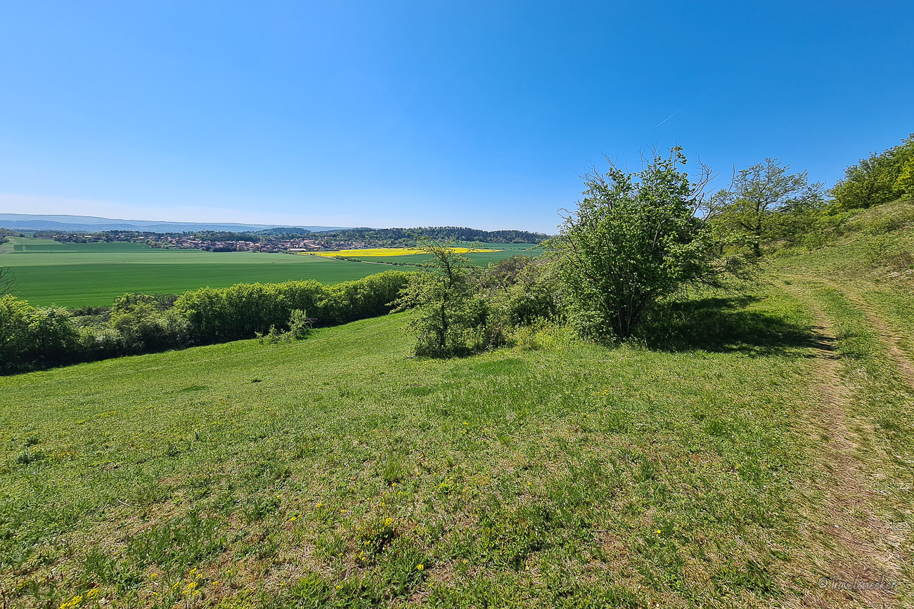 Diese schöne Rundwanderung macht man am besten im Frühjahr, wenn die Streuobstwiesen bühen. Wir waren ein kleines bisschen zu spät dran, denn die Obstbäume wurden schon grün und hatten überwiegend ihre Fruchtbüten verloren. Dennoch hat es sich gelohnt, denn die Streuobstwiesen sind nicht das einzige Highlight. Wenn man von Börnecke aus startend den Betonweg bis zu den Streuobstwiesen hoch geht und am Schusterberg rechts einen schmalen Weg hoch geht, kommt man nach kurzer Zeit zu einem Hang mit Adonisröschen. Ich wusste gar nicht, dass es hier auch welche gibt, denn wir hatten extra mal eine Wanderung zu den Adonisröschen bei Hoppenstedt Nähe Hornburg gemacht. Es war für uns eine positive Überraschung, zumal an diesem Hang (für mein Empfinden) mehr Adonisröschen zu sehen waren. Der leicht versteckte und nicht sofort erkennbare Weg ist allerdings tatsächlich schlecht zu finden, da das Schild zu der Adonisröschen-Wiese genau an dem Punkt irreführend geradeaus zeigt.