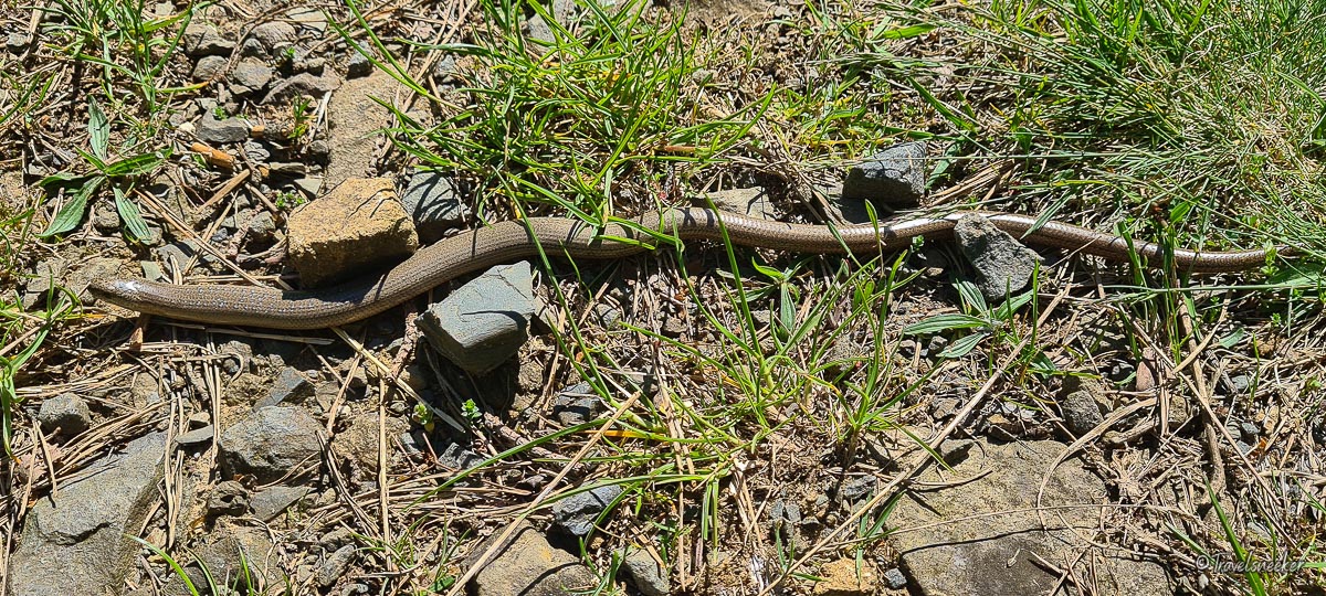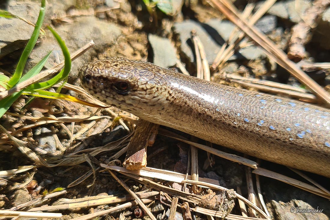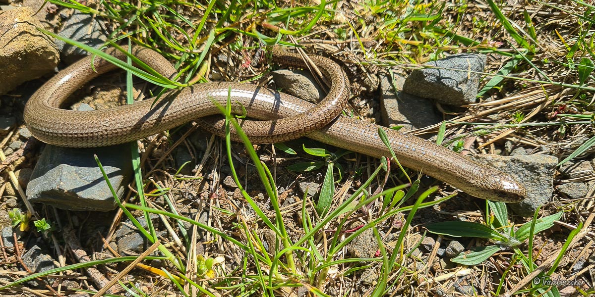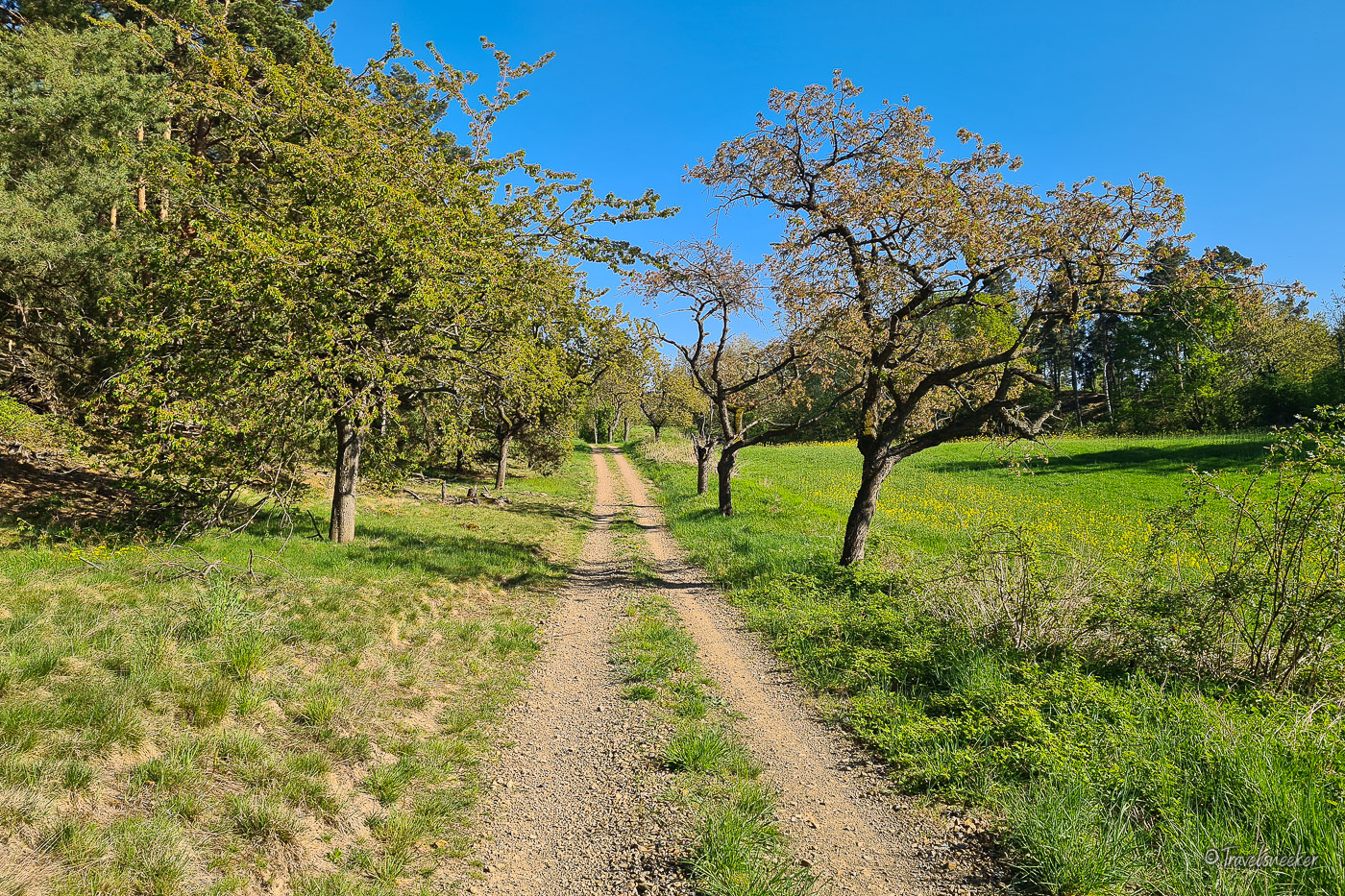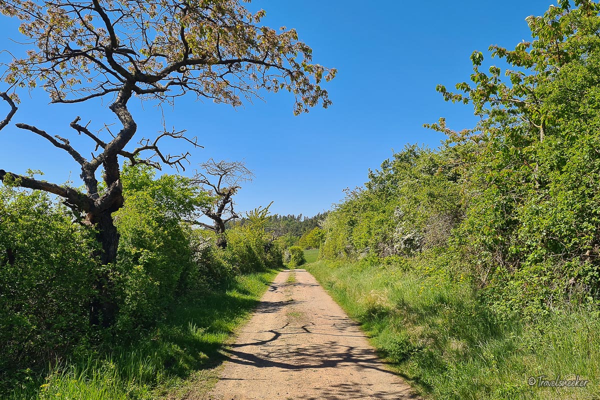 Auf der gegenüberliegenden Seite führt der Wanderweg dann entlang des Tönnigsbergs durch die Streuobstwiesen mit herrlich alten und knöchernen Obstbäumen, die teilweise schon vertrocknet und abgestorben aussehen, aber das mag täuschen. Was mir auch sehr gefallen hat, sind die herrlichen Aussichten, die man auf dem gesamten Rundwanderweg immer wieder hat. Die Wege sind durchweg gut begehbar und ohne nennenswerte Steigung, bis auf den Teil, wo es den Tönnigsberg hinauf geht. Das ist dann ein steiler, aber nicht allzu langer Anstieg. Auf dem Kiesweg haben wir eine Blindschleiche entdeckt, die man ja eigentlich selten zu Gesicht bekommt. Sie stellte sich auch eine Zeit lang tot, bis es ihr in der prallen Sonne wohl zu heiß wurde. Ja, das ist auf diesem Rundwanderweg zu bedenken: man läuft überwiegend in der Sonne, nur der Abschnitt durch den Wald des Tönnigsberg bietet Schatten. Auf dem Rückweg nach Börnecke geht es wieder einen schönen Weg entland von Streuobstbäume.