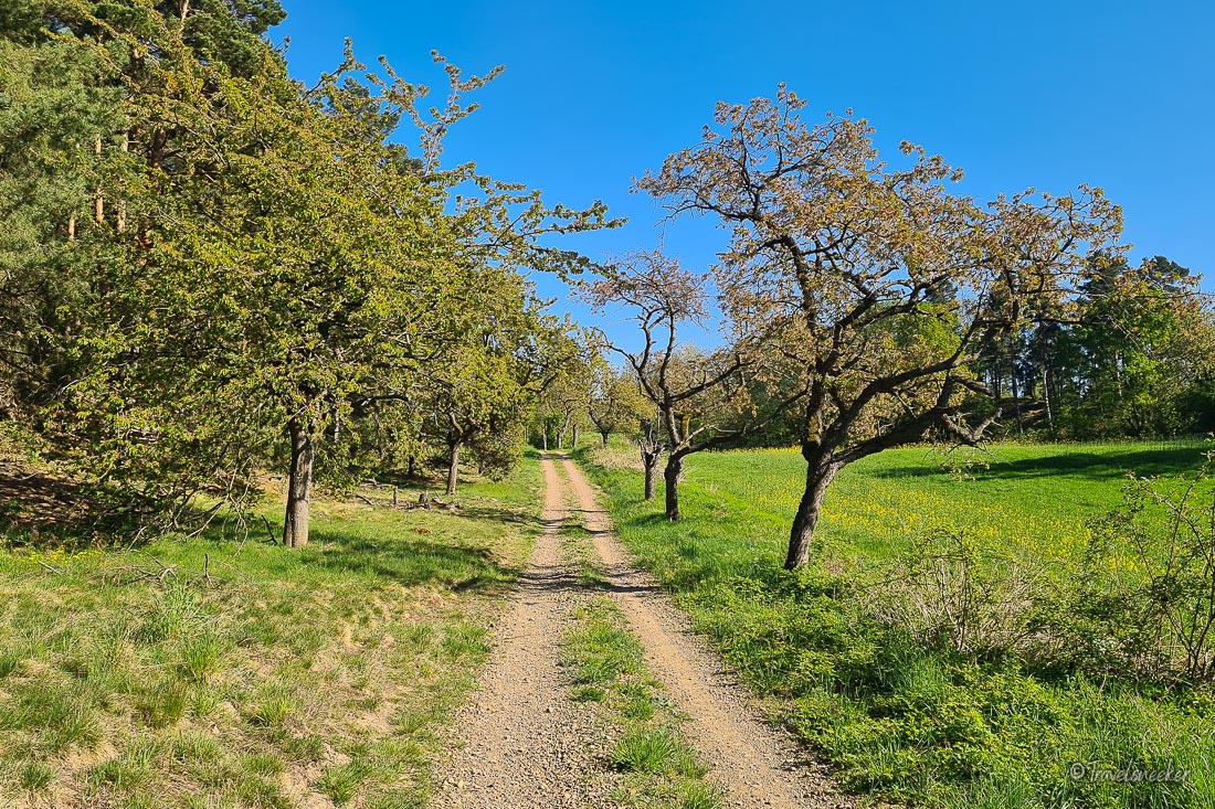 Diese schöne Rundwanderung macht man am besten im Frühjahr, wenn die Streuobstwiesen bühen. Wir waren ein kleines bisschen zu spät dran, denn die Obstbäume wurden schon grün und hatten überwiegend ihre Fruchtbüten verloren. Dennoch hat es sich gelohnt, denn die Streuobstwiesen sind nicht das einzige Highlight.